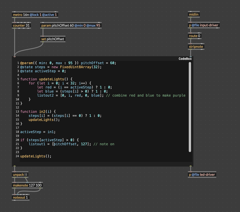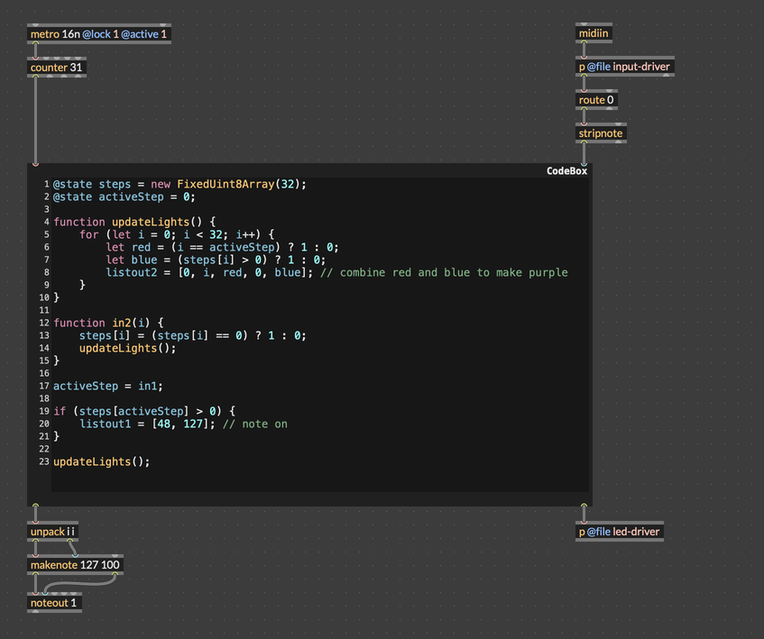 To wrap it all up, we just need some way to turn these light-control lists into MIDI. This is easy, we can just use the led-driver abstraction. Finally we have our completed sequencer.