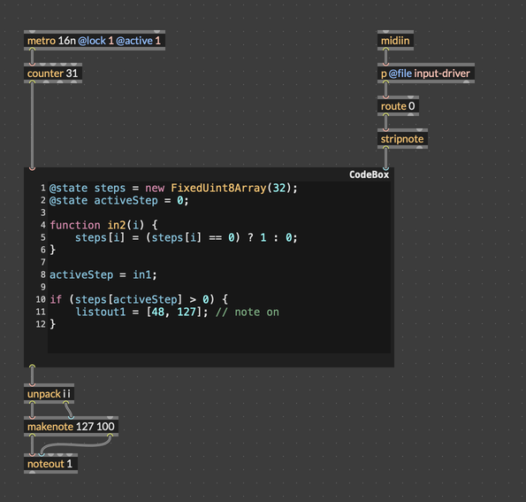 Now we can think about the logic itself. Basically, whenever the user presses a pad, we want to toggle the state of that pad, either from off to on, or from on to off. Then, as the current step advances, we want to trigger a MIDI note output. That logic could look something like this: