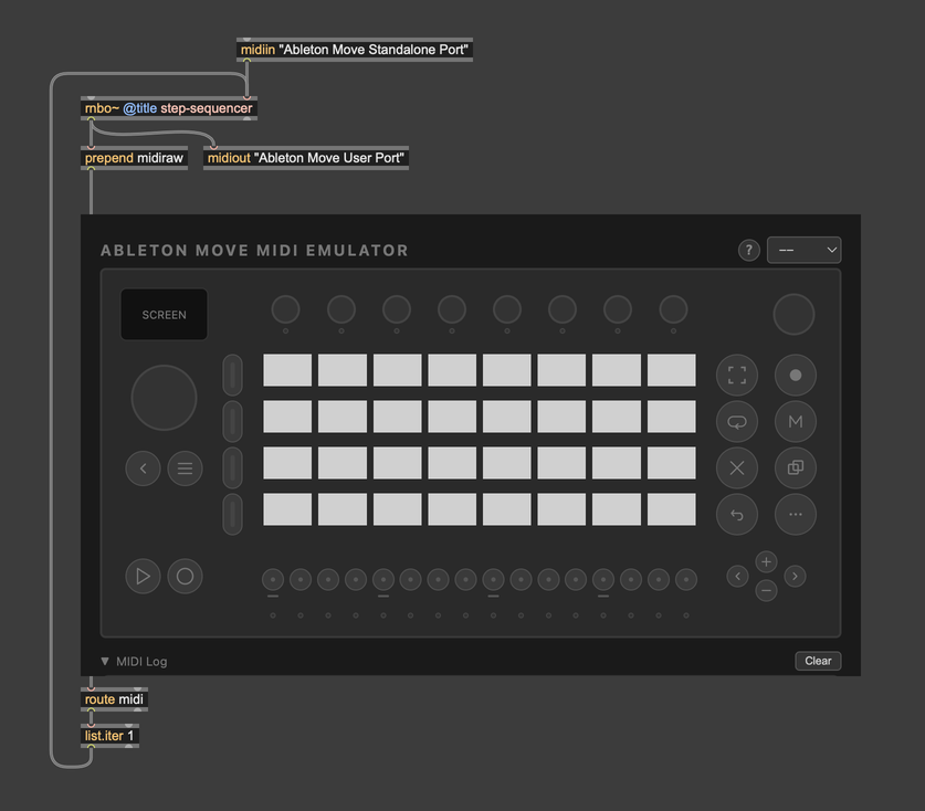 At the same time, we use the midiin and midiout objects to route MIDI to and from the physical Move, if one is connected. Remember that if you want a button press to send MIDI to the Ableton Move Standalone Port, you'll need to configure that behavior in the Graph Editor, as we saw in the prevous guide.