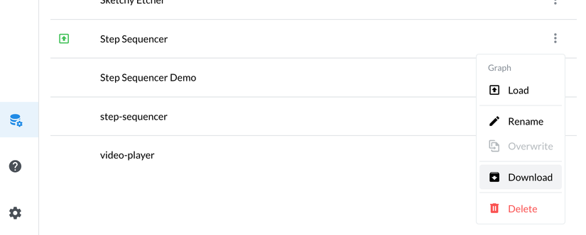 Let's export this amazing synthesizer. In the Graph Editor, click on the Manage Resources icon in the left toolbar. Find the current graph (you'll need to have saved it), and click the three-dot menu to the right to find the Download option. This should save a .rnbopack file to your computer. Anyone with RNBO Move Takeover can import and run this graph. They don't need Max or RNBO, just a Move with RNBO Move Takeover installed.