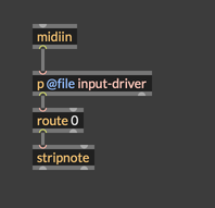 Now, what about receiving input from the user? We know how to do this already: we can use midiin in conjunction with the input-driver abstraction to read inputs from the Move. After that, we can use a route object to filter for pads only, an a stripnote to send a message when a pad is pressed, but not released.