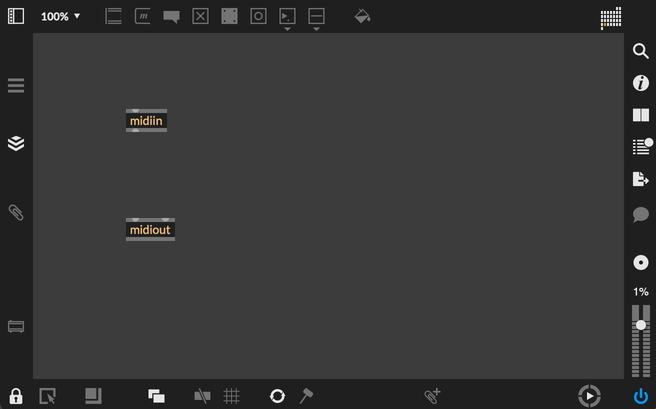 Open up the RNBO subpatcher. If you copied the compressed patcher from the above image, you'll see nothing more than a MIDI input and output.