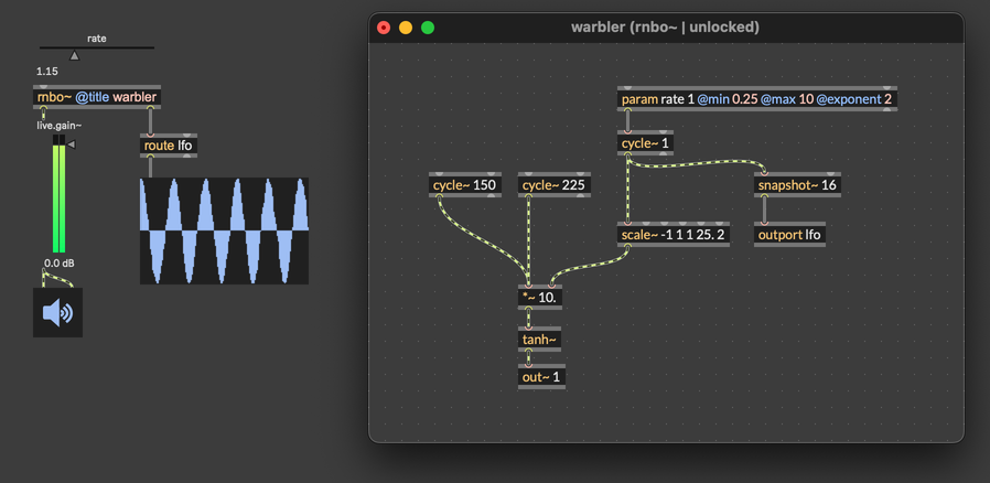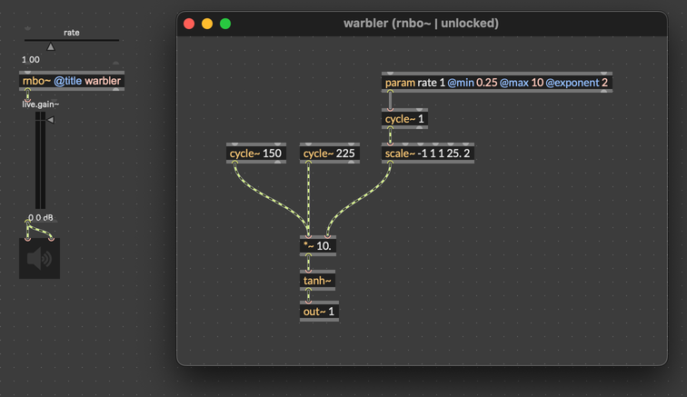 Let's start with an extremely simple RNBO patch. This patch makes a warm, warbly drone by overdriving a pair of oscillators.