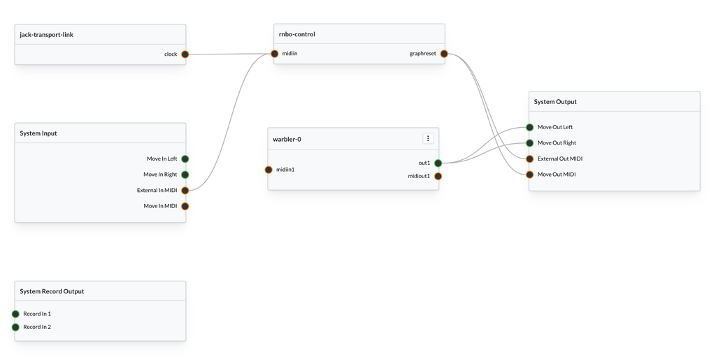 Now that we've got our drawing code in place, let's export to the Move. Make sure your Move is in RNBO Move Takeover mode, then export the patch to the Move from Max. In the graph editor (http://move.local:3000/), you should connect the node to audio output if you want to hear the patch. Because we're not changing the state of any LEDs using MIDI output, there's no need to connect MIDI to "Move Out MIDI". You don't need to do anything special to see the User View either.