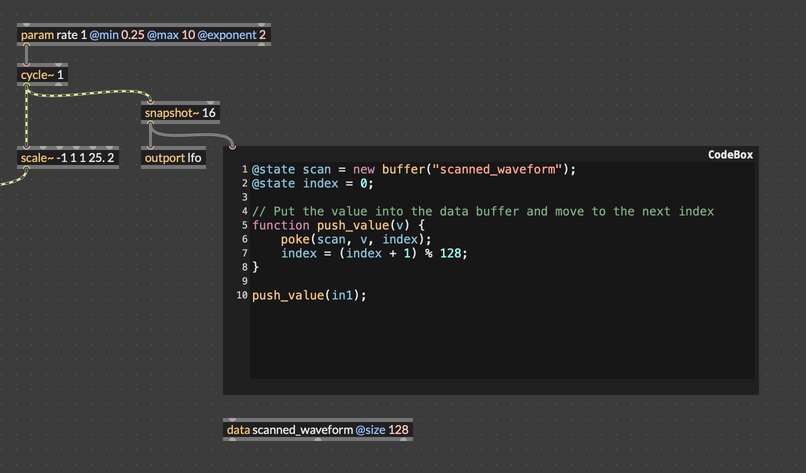 After creating the data object and adding this code to a codebox object, we just need to connect the output of snapshot~ to codebox to trigger a redraw.
