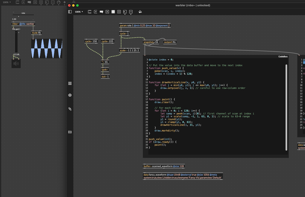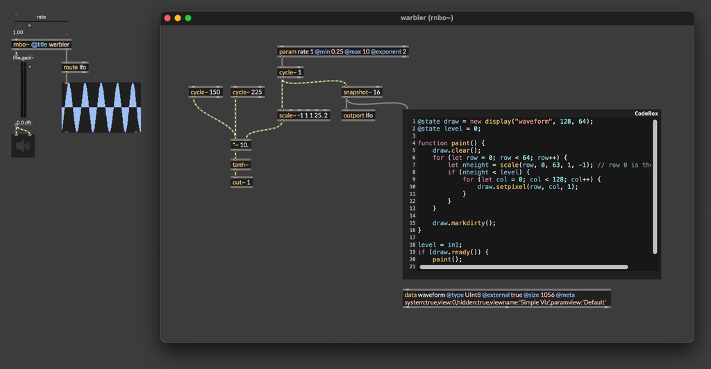 This creates a display operator named "draw", bound to the data object named "waveform". It also gives the display a default width of 128 and height of 64, the same as the display on the Move. This will of course cover the whole display. You can use a smaller display, for example if you want to layer multiple display objects.