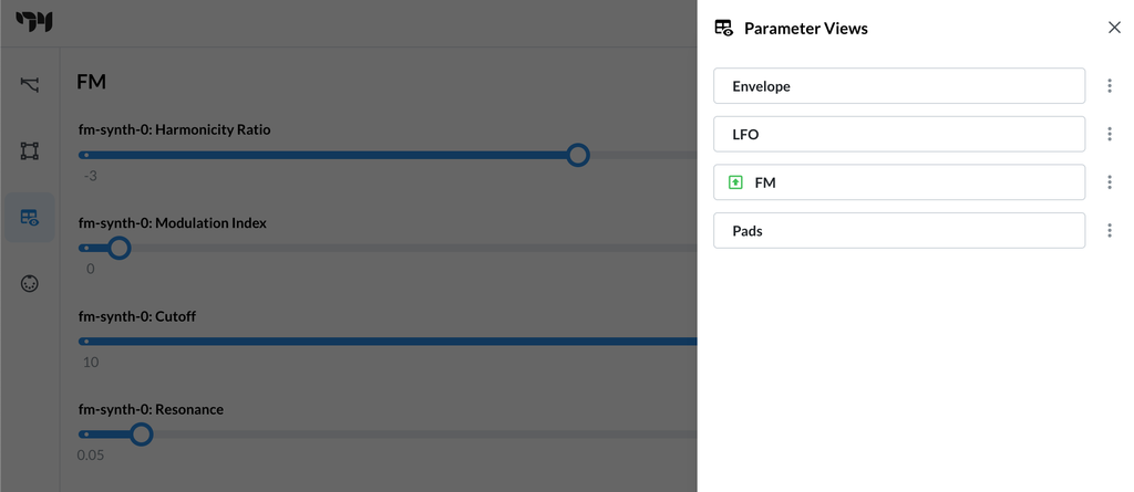 We've created two User Views so far, one for the ADSR envelope and one for the LFO. Let's go ahead and create two Parameter Views as well. These can be anything you want. I made one called FM that collects the parameters Harmonicity Ratio, Modulation Index, Cutoff, and Resonance, and another one called Pads that uses the Mode and Root parameters from the move-keys node. In totaly now you should have four parameter views: Envelope, LFO, FM, and Pads.