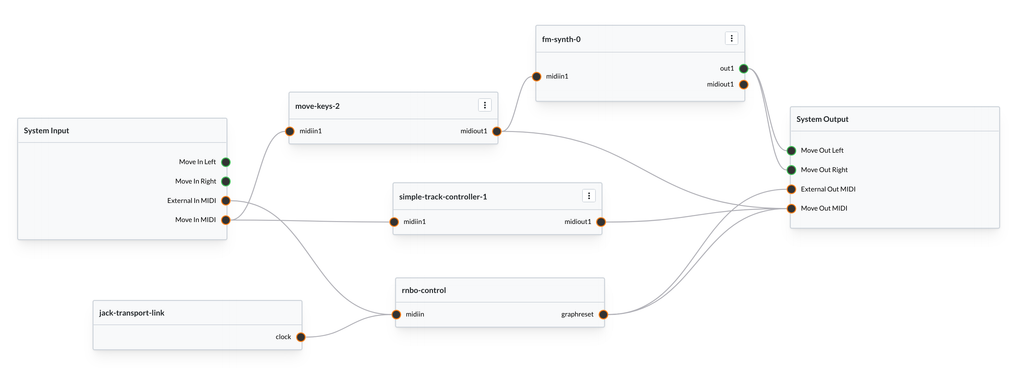 So, there should be a connection from Move In MIDI, a connection to Move Out MIDI, and a connection to the synthesizer. With these two nodes in your graph, you should set up your graph like this: