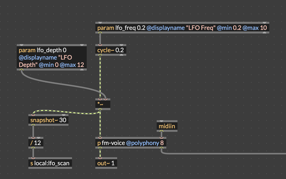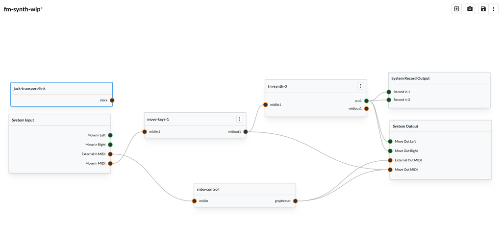 Splitting functionality like this should make it easier to test and debug each one. Keeping things modular also means that we can reuse these pieces outside of Move. The FM Synth node has custom user views, but you could use it in a VST or another RNBO target without issue.