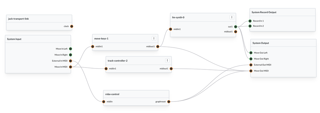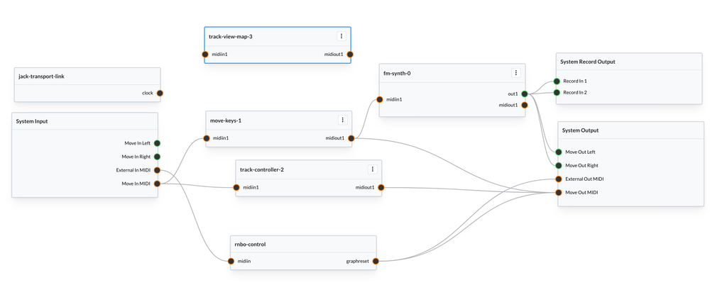 Go ahead and export this patch. After you add the track-controller node to the graph, connect it to Move In MIDI and to Move Out MIDI. Save and reload the graph, and you should see the track buttons light up, each with a different color.