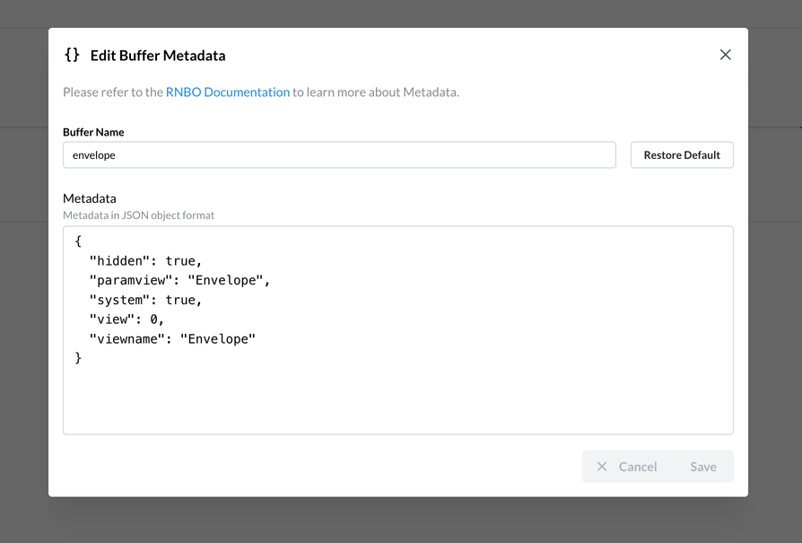 You can check and update metadata for a buffer object from the Graph Editor. Click thes Devices icon in the left navbar, then on the Buffers tab, and then use the three-dot menu next to the buffer whose metadata you want to edit.