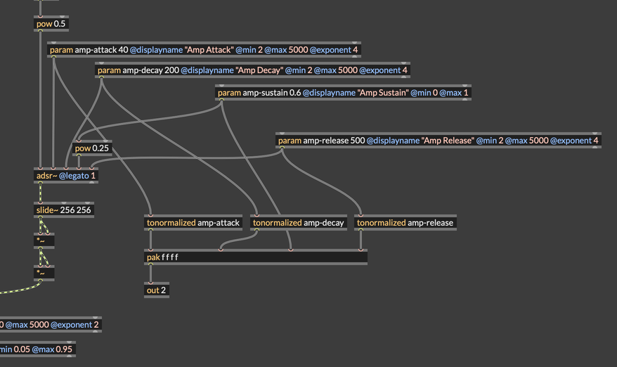We have some options as to how we can handle this. It's actually totally fine to define our user view in the polyphonic voice itself, along with the code to draw to the display. However, the approach we're going to take here is to use an outport to send the envelope parameters to the main RNBO patch, and to do our envelope drawing there.