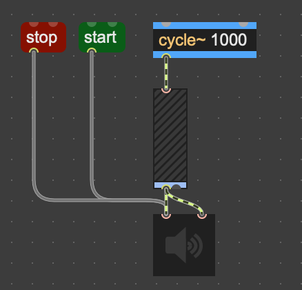 startmessage in the tutorial patcher. Click and drag on the gain~ slider until it's set to somewhere in the middle of its length. Adjust your audio amplifier to a comfortable setting. Once you're satisfied that the patcher is working, click on thestopmessage box to turn off that annoying test tone.